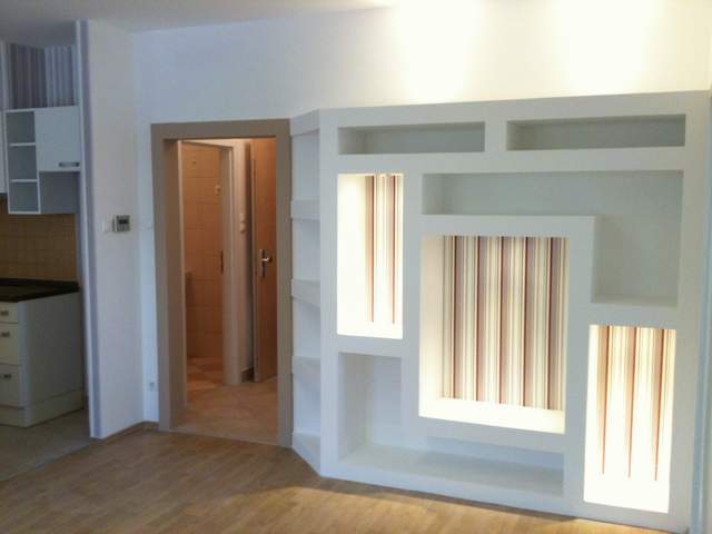 Az új lapburkolat és a festés után, tapétáztunk. Befüggesztett álmennyezetet készítettünk rejtett LED világítással, valamint egyedi gipszkarton design polcot. A meglévő konyhát pulttal egészítettük ki.