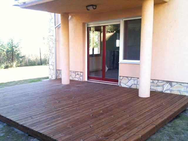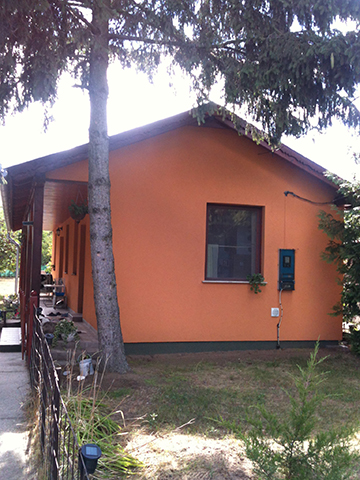 Könnyűszerkezetes ház volt megrendelőnk kérése, mely a hőszigetelés után mediterrán jellegű nemes vakolatot kapott.A ház alapterülete 60 m2, a fűtést cirkó biztosítja, a nyílászárók hossz toldott borovi fenyőből készültek, a terasszal egységesen mahagóni színűre lazúrozva.