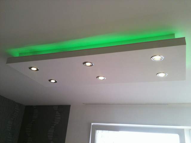 A fehér falszínt egy fiatalos tapétával „dobtuk” fel. Emellett a megrendelő elképzelése alapján, gipszkartonból készítettünk egyedi design polcot. Végül két befüggesztett álmennyezet került kivitelezésre. A pult alá rejtett LED világítás került.