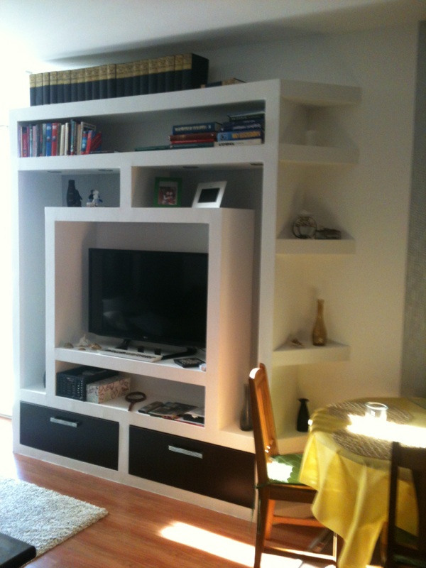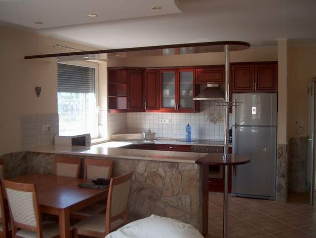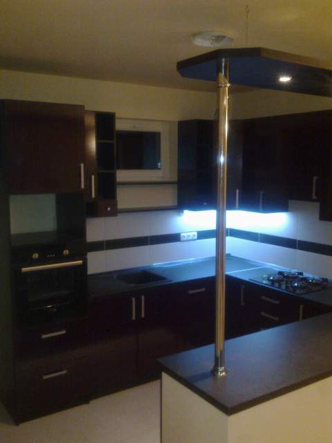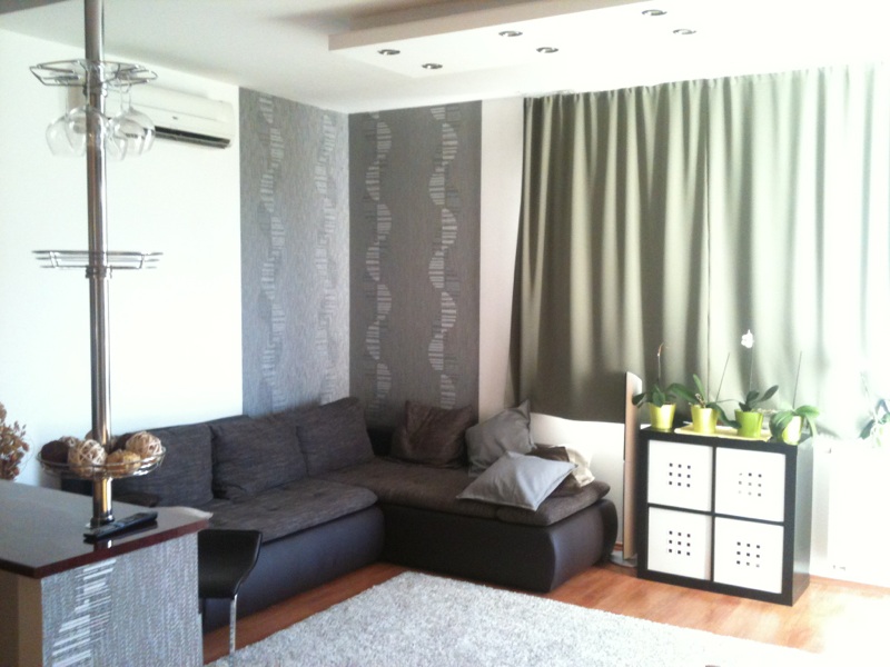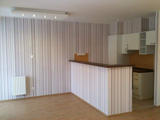 Az új lapburkolat és a festés után, tapétáztunk. Befüggesztett álmennyezetet készítettünk rejtett LED világítással, valamint egyedi gipszkarton design polcot. A meglévő konyhát pulttal egészítettük ki.