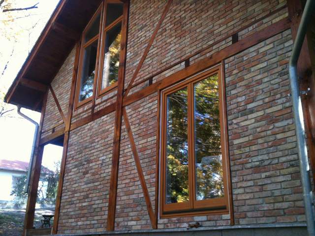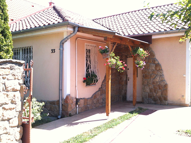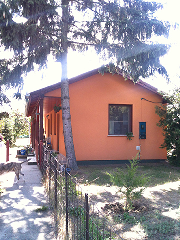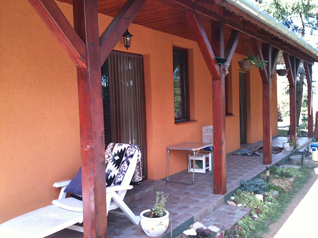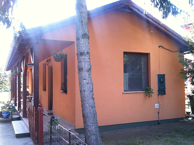 Könnyűszerkezetes ház volt megrendelőnk kérése, mely a hőszigetelés után mediterrán jellegű nemes vakolatot kapott.A ház alapterülete 60 m2, a fűtést cirkó biztosítja, a nyílászárók hossz toldott borovi fenyőből készültek, a terasszal egységesen mahagóni színűre lazúrozva.