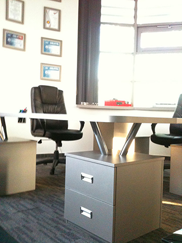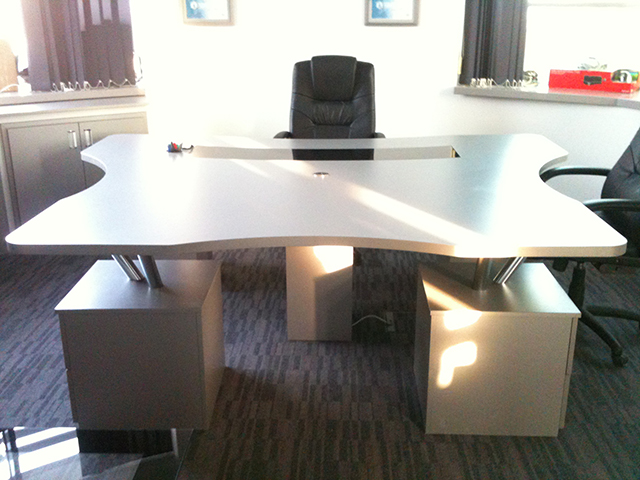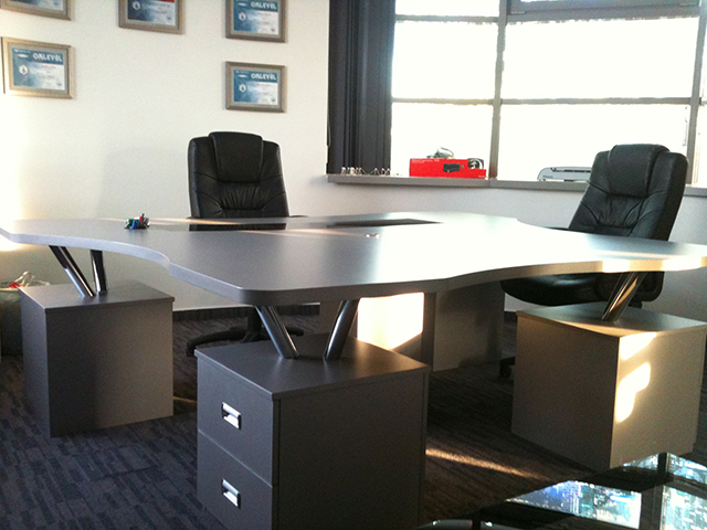 Megrendelőnk egyedi elképzelése alapján készítettük el.A szekrényeket gipszkarton vázba építettük be.Az asztal 2x2.5 m nagyságú, mely alatt 4 db fiókos konténer kapott helyet.