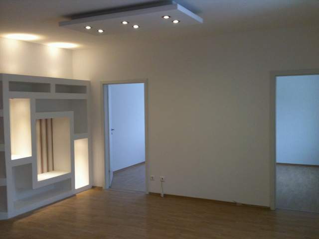 A fehér falszínt egy fiatalos tapétával „dobtuk” fel. Emellett a megrendelő elképzelése alapján, gipszkartonból készítettünk egyedi design polcot. Végül két befüggesztett álmennyezet került kivitelezésre. A pult alá rejtett LED világítás került.