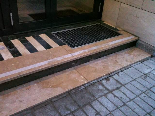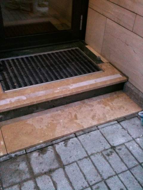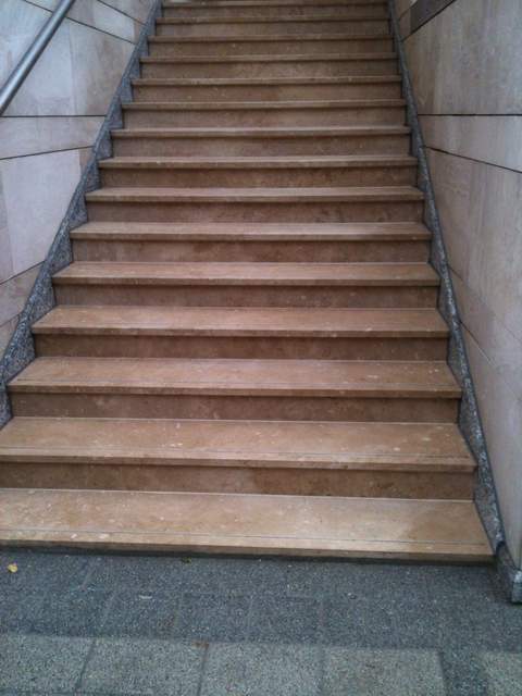 Meglévő kültéri lépcsőburkolat bontása, új burkolat készítése. A burkolat anyag 3,5 cm vastag tömörített Travertin mészkő volt, melybe csúszásgátló sín lett beépítve.