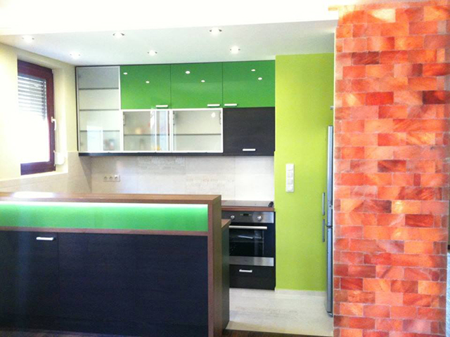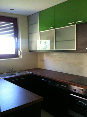 Minden egyedi elképzelés alapján készült.A fürdőszoba hangulatát a bambuszos dekor csempe és kádparaván adja meg, míg a nappalit és a konyhát a zöld színnel próbáltuk élénkebbé és fiatalossá "varázsolni". A lakás egyik különlegessége a falszín, melyet különböző fényviszonyok mellet, hol sárgának, hol zöldnek látni.